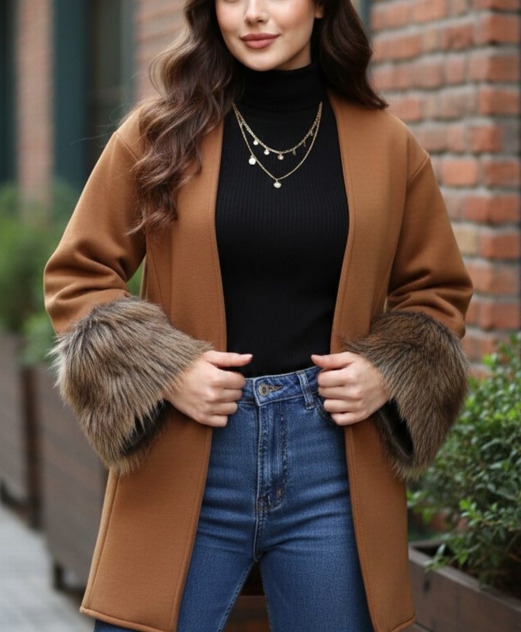 Taba renkli, yumuşak yün kumaştan yapılmış, uzun kollu ve kemerli, notlu yakalı bol kesim kadın kabanı. Minimalist ve desensiz tasarıma sahiptir, günlük kullanım için uygundur.