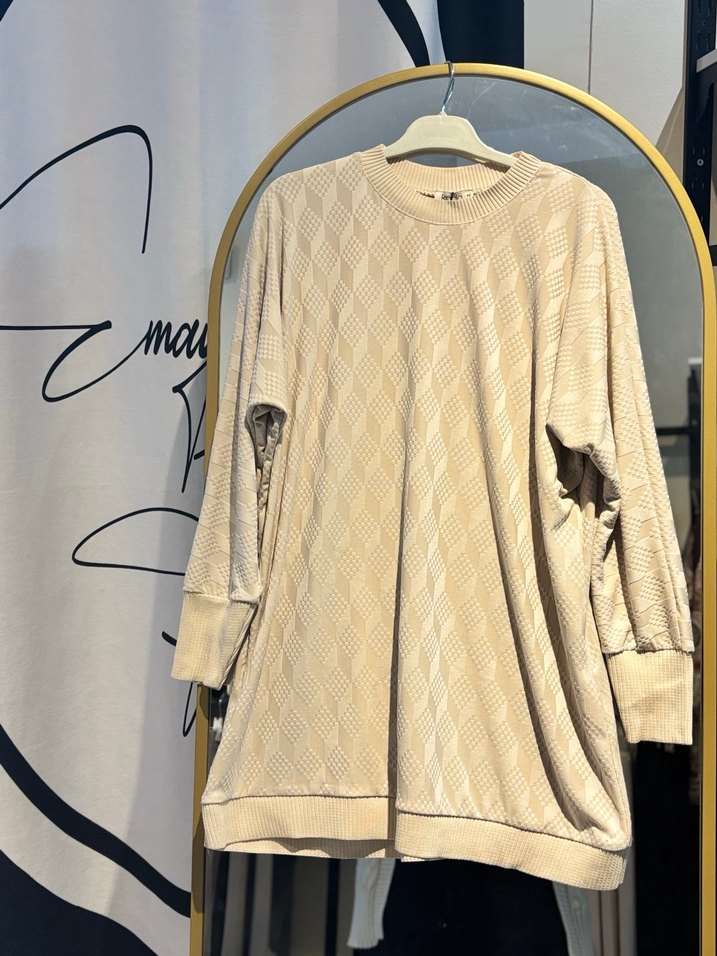 Açık bej renkli, triko dokulu keten kumaştan uzun kollu, bol kesim kısa kazak. Yuvarlak yaka ve desensiz yapısıyla rahat ve şık bir tercih.