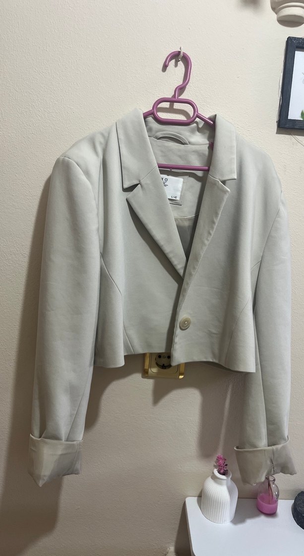 Bej renkli, kısa kesim, düğmeli kadın blazer. Uzun kollu, klasik yakalı ve düz desensiz. Ofis ve günlük şıklık için uygun.