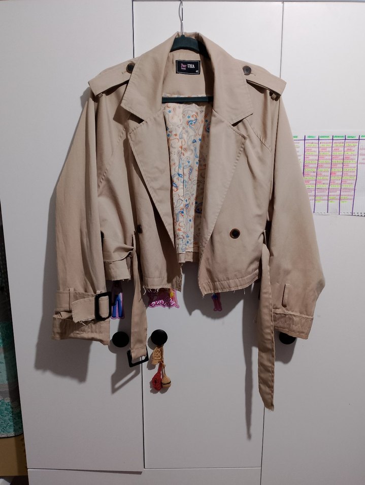 Bej renkli, kısa kesim kadın trençkot. Düğmeli ön ve askılı kollara sahip, gevşek kesim ve kumaş dokusu bulunur. Tek hasarı sol kolunda kemer yok