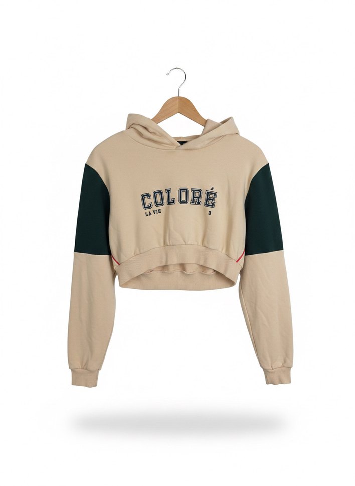 Bej Kısa Kesim Kapüşonlu Sweatshirt