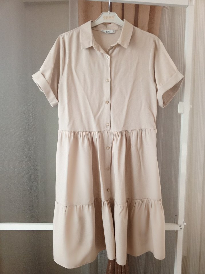 Bej keten mini elbise, kısa kollu ve yakalıdır. Düğmeli ve bol kesimdir, günlük kullanım için uygundur.
