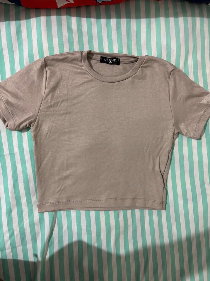 Bej renk, kısa kollu ve bisiklet yaka tişört, yumuşak sentetik kumaştan üretilmiş olup, sade ve şık bir görünüm sunar. Günlük sokak stiline uygundur.