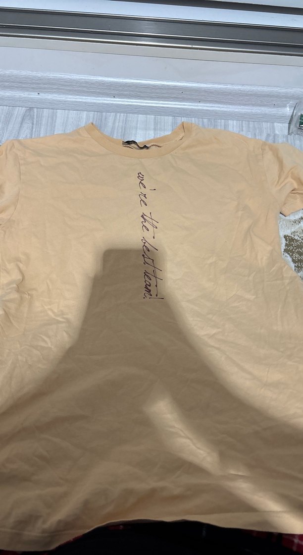 Bej renkli, kısa kollu, yuvarlak yaka, keten kumaştan yapılmış bol kesim tişört. Dikey baskılı yazı detayıyla rahat ve şık görünüyor.