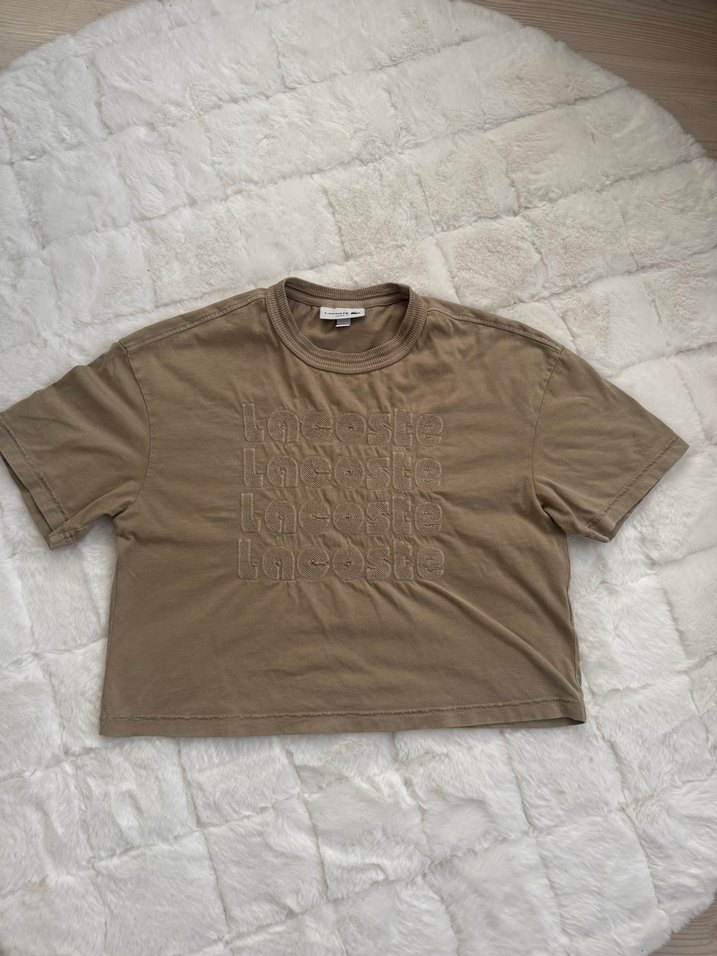 Keten kumaştan, bej renkli kısa kollu kadın tişörtü. Bisiklet yaka ve baskılı desene sahip, bol kesim ve normal boyda, günlük rahat stil için uygundur.