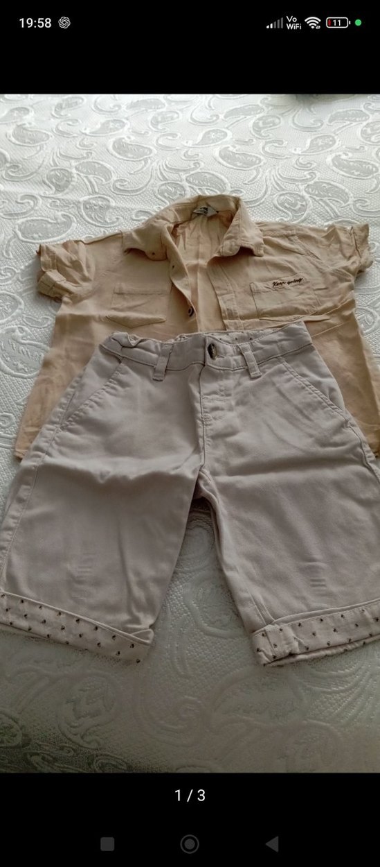 Bej kısa kollu, yakalı ve düğmeli gömlek ile gri pamuk şortlardan oluşan bebek takımı, şort paçalarında ince desen bulunur.