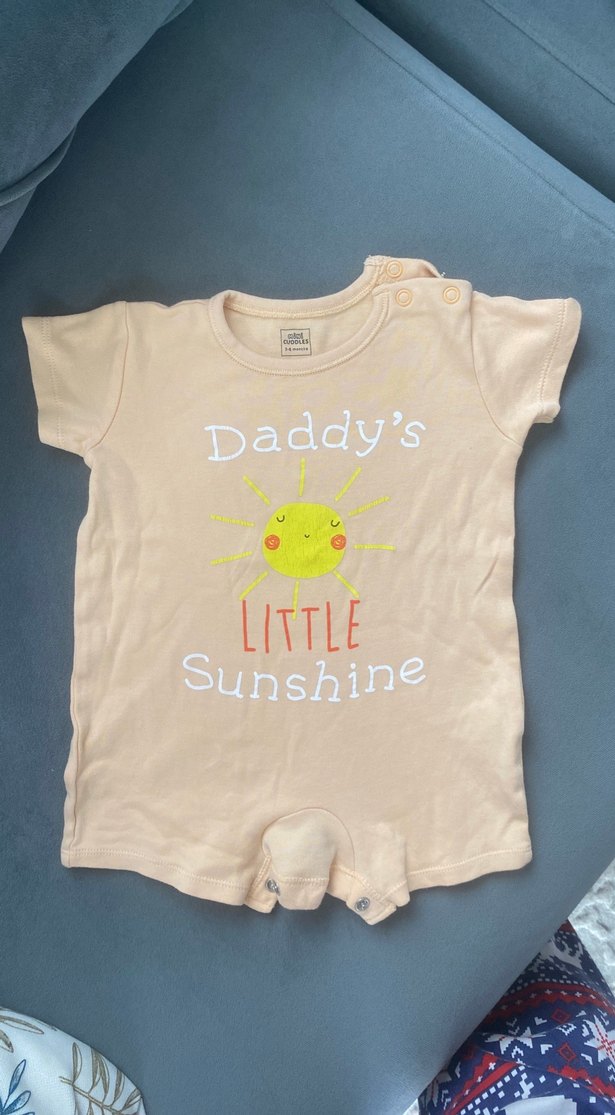 Bej renk, kısa kollu, yuvarlak yakalı bebek tulumu. Üzerinde neşeli güneş ve "Daddy's Little Sunshine" yazılı baskı bulunur. Yumuşak ve sıcak kumaştan yapılmıştır. ☀️