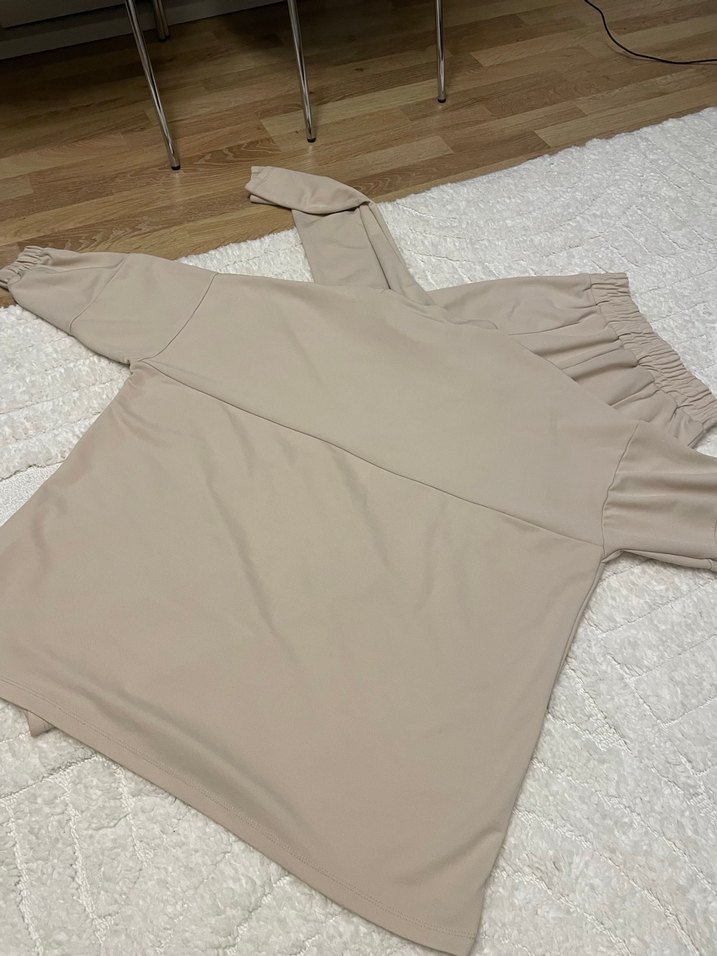 Bej renkli, kısa kollu ve boğazlı kadın bluz, yumuşak sentetik kumaştan üretilmiştir. Rahat kesimi ve kısa boyuyla günlük rahat şıklık sunar. Tüm ölçüler görsellerde mevcuttur. Pantolonun belirli lastiklidir. Bir 60 boy 80 kg’ da giyildi. Pantolonun alt kısmında yıpranma mevcut. Kol boyu omuzdan 34 santim. Kol boyu yakadan 63 santim