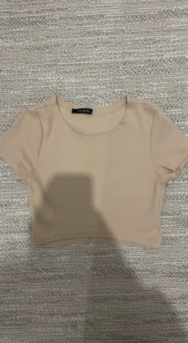 Bej renk, kısa kollu ve yuvarlak yakalı bu crop top, vücuda oturan kesime sahiptir. Pürüzsüz sentetik kumaştan yapılmıştır ve günlük kullanım için uygundur.