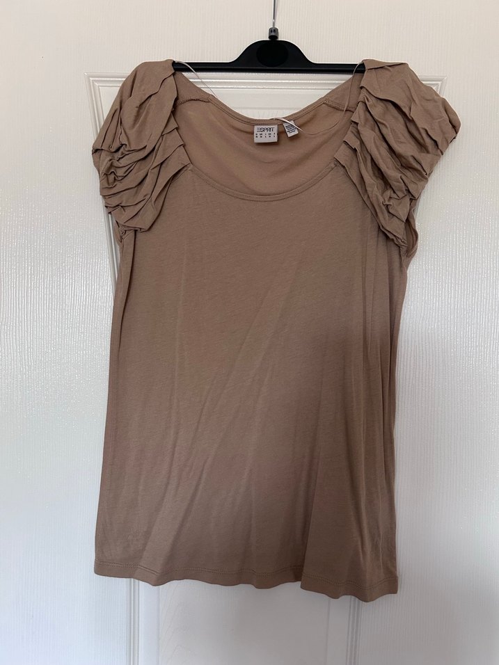 Bej renkli, kısa kollu, yuvarlak yaka tişörtü. Drapeli kol detayları ve rahat kesimi ile günlük kullanıma uygun.