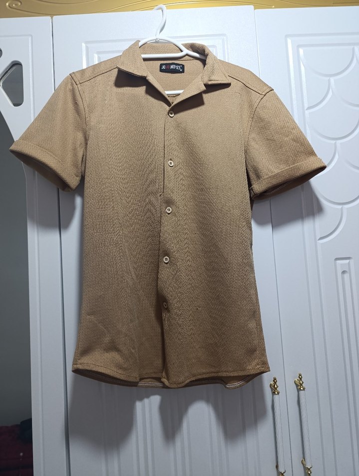 Bej renkte, kısa kollu, düğmeli ve normal boyda erkek gömleği. Notch yaka ve parlak görünüme sahip, rahat kesim.