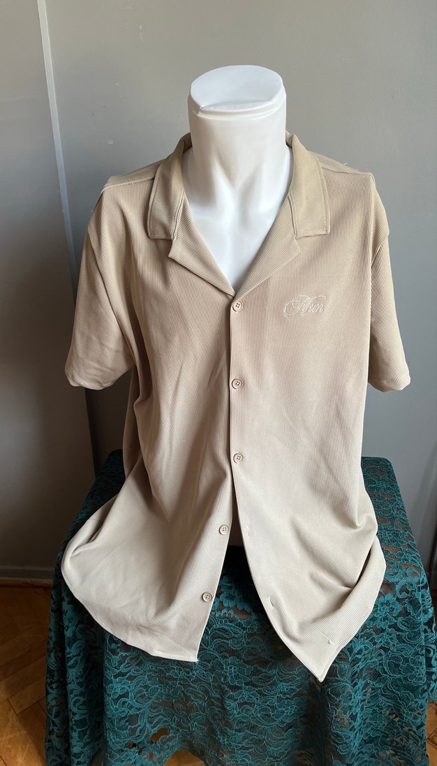 Bej renkli, kısa kollu, düğmeli ve yakalı erkek gömleği. İpek gibi yumuşak kumaştan, bol kesim ve normal boyda, günlük ve ofis kullanımı için uygundur.