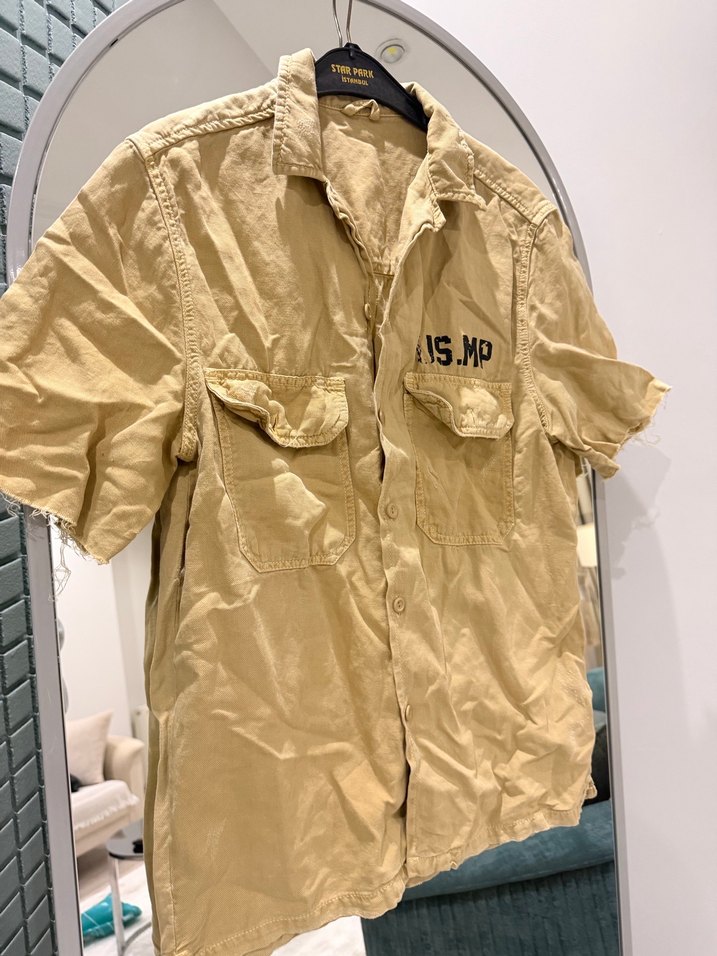 Bej renkli keten, kısa kollu, düğmeli ve cep detaylı erkek gömleği. Salaş kesim ve notched lapel yakaya sahip, vintage tarzda günlük kullanıma uygun.