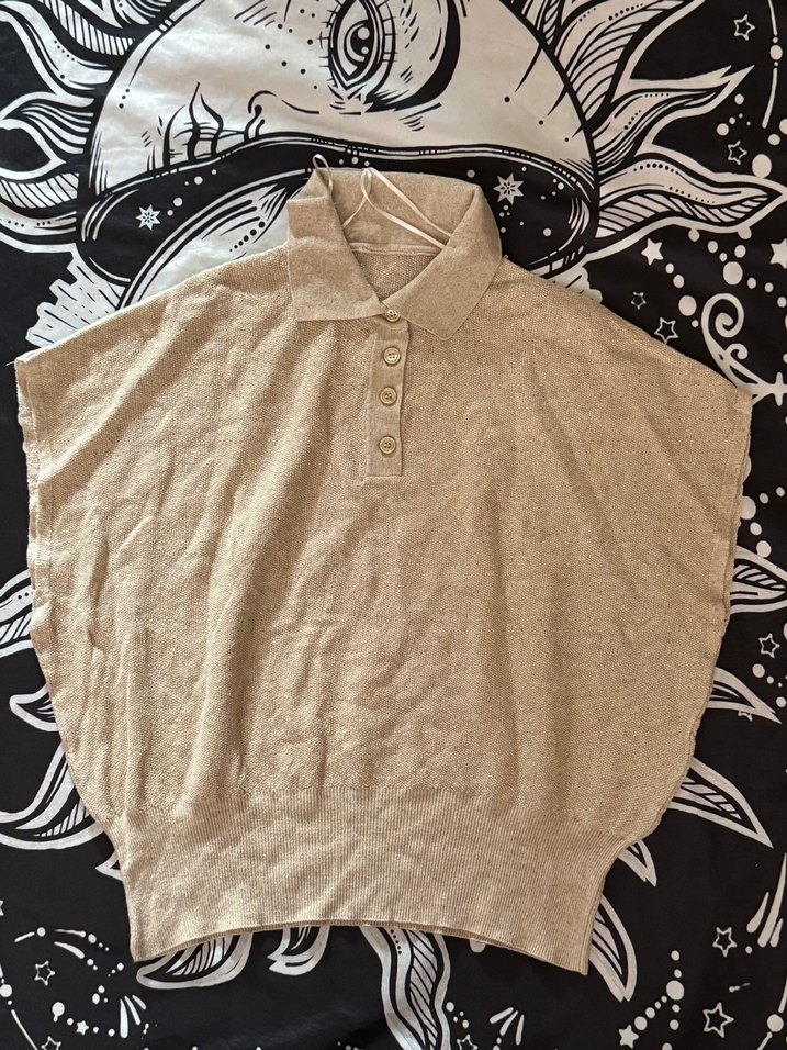 Bej renkli keten kumaştan, kısa kollu ve yakalı kadın kazak. Düğmeli ve bol kesim, rahat sokak stili için uygundur.