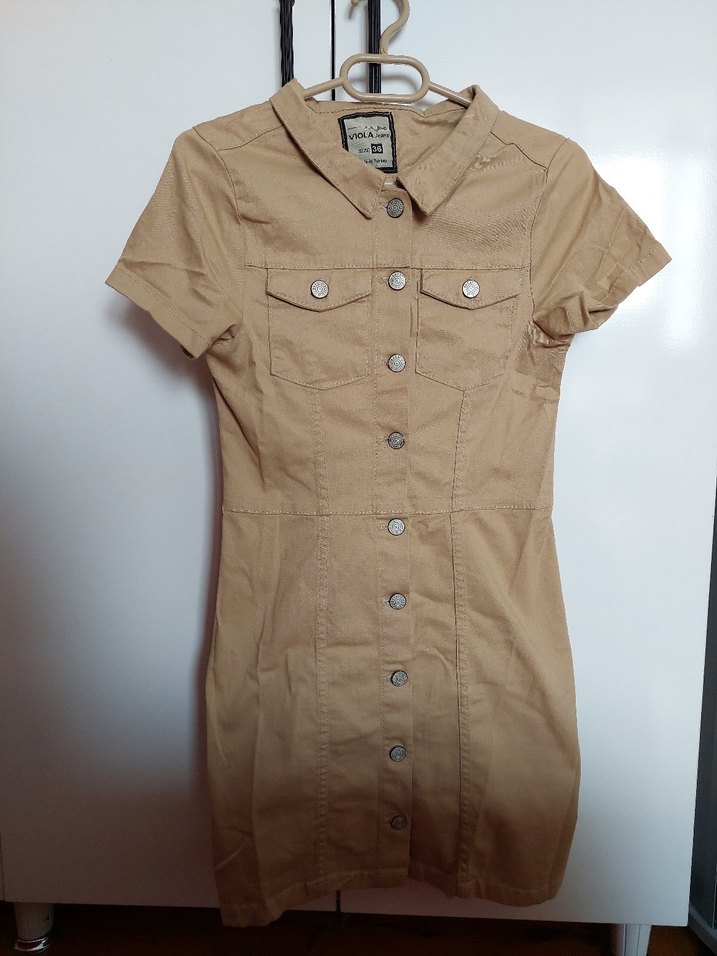Bej Kısa Kollu Düğmeli Midi Elbise