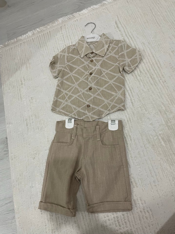 Bej renkli, kısa kollu ve düğmeli gömlek ile notched lapel yakalı erkek bebek takımı. Yumuşak keten kumaştan, uyumlu şortlu.