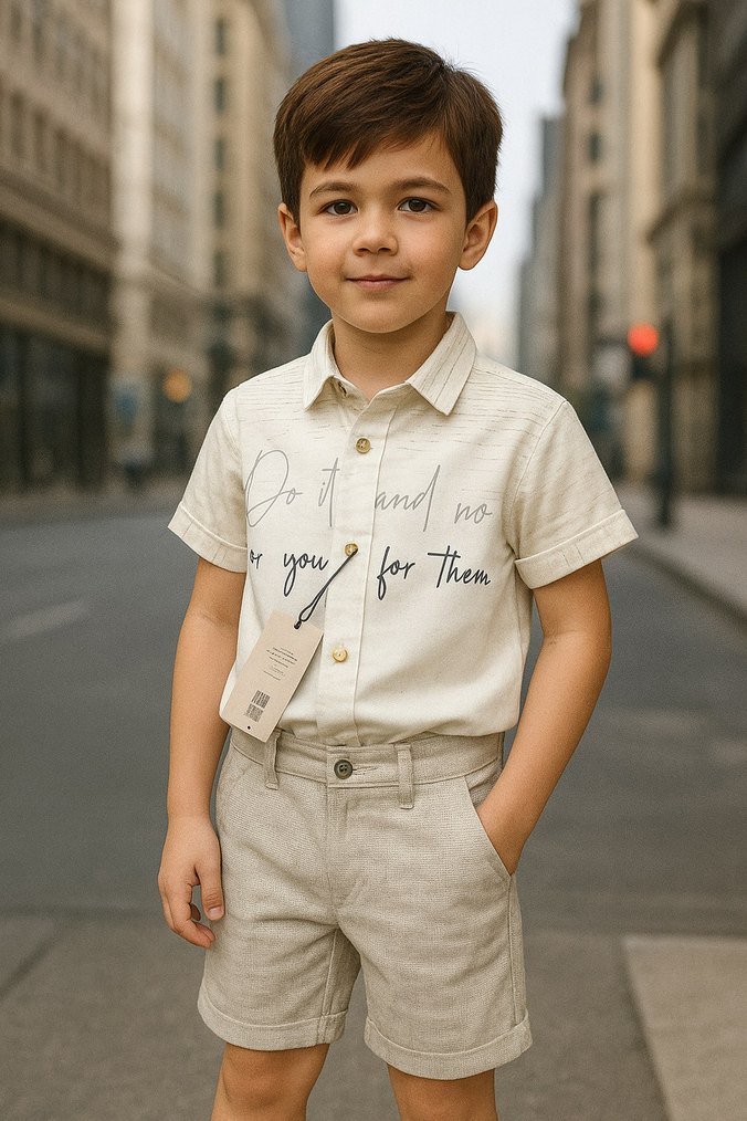 Bej renkli, kısa kollu, pamuklu erkek çocuk gömleği. Notlu yaka ve baskılı desene sahip, regular fit ve düğmeli tasarım. 1-3-4 yaş mevcuttur