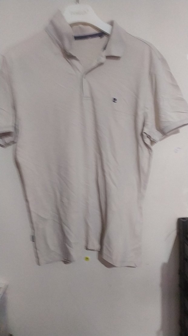 Bej renkte, keten kumaştan yapılmış kısa kollu, yakalı ve bol kesim erkek polo tişört. Günlük kullanıma uygun, rahat ve şık görünümlü.