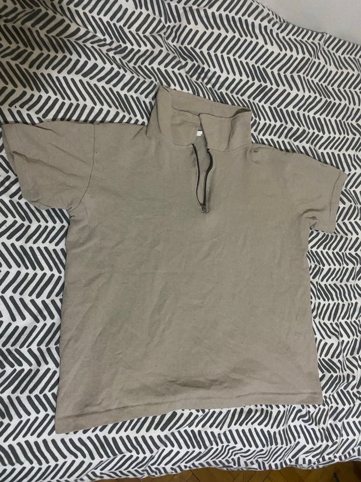 kısa kollu, yakalı ve bol kesim erkek tshirt. Bej renkte, desensiz ve günlük kullanıma uygun rahat bir model.
