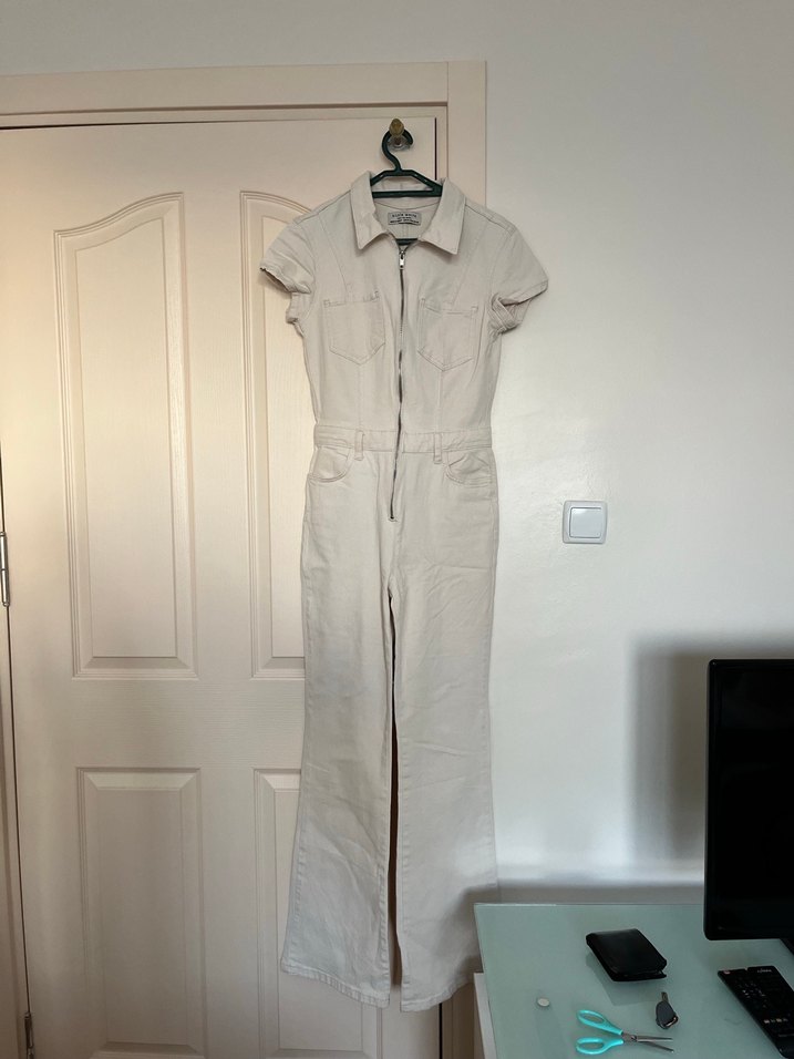 Bej renkli, keten kumaştan yapılmış kısa kollu,kadın tulum. Normal uzunlukta ve regular fit, günlük rahat kullanım için uygundur. ✨