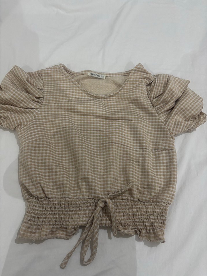 Bej renkli, kısa kollu, fırfırlı ve yuvarlak yakalı kadın bluz. Yumuşak keten kumaştan, bel kısmı lastikli ve bağcıklı, rahat kesim. Günlük kullanım için uygun.