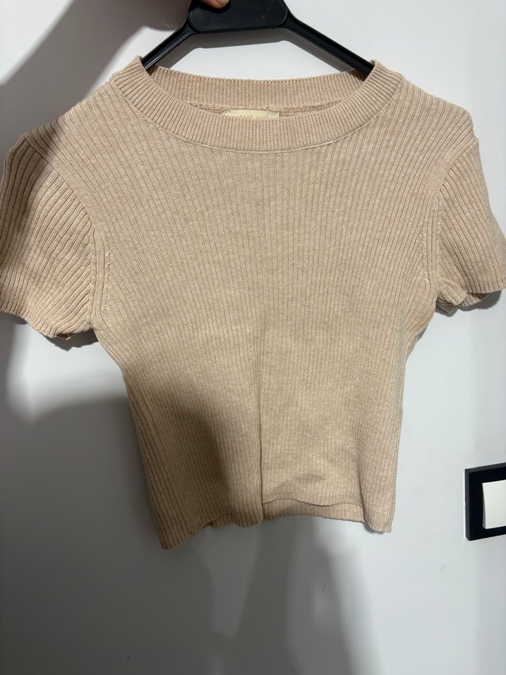 Bej renkli, yuvarlak yakalı ve kısa kollu kadın trikosudur. Fitilli, kısa boy ve rahat bir kesime sahiptir. Günlük kullanıma uygundur.