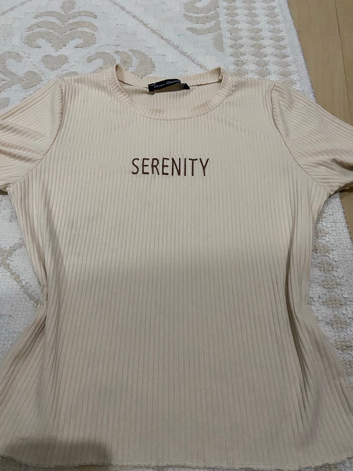 Bej kısa kollu, yuvarlak yakalı, fitilli dokulu triko tişört. Önünde "SERENITY" yazısı baskılıdır. Parlak görünümlü sentetik kumaştan üretilmiştir. ✨