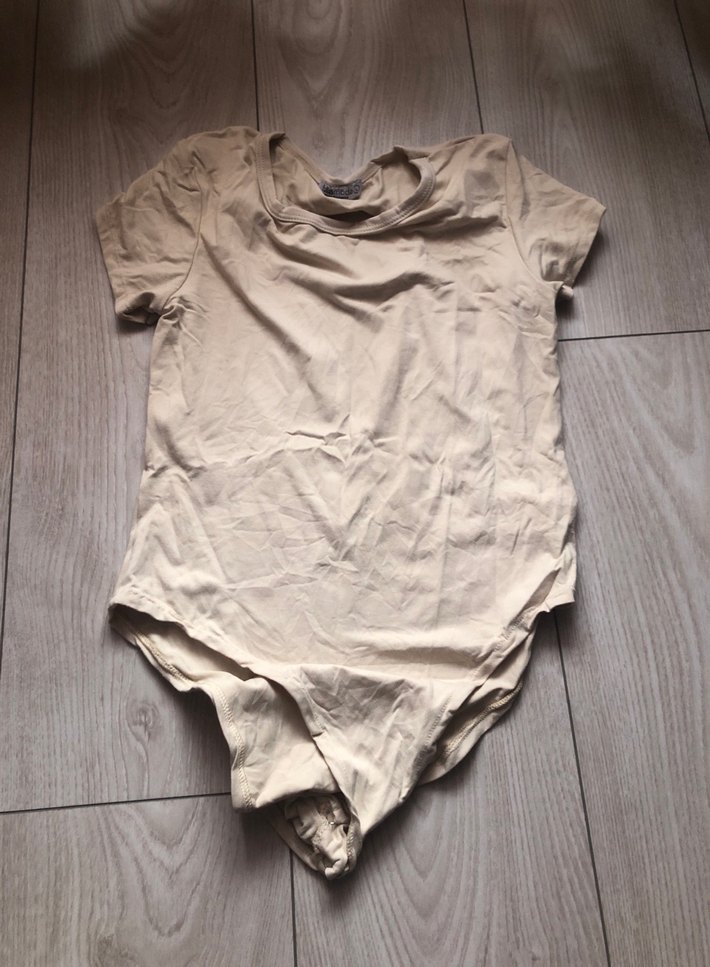 Bej renkte, kısa kollu, bisiklet yaka ve rahat keten kumaştan yapılmış, sade ve şık hamile tişörtü. Günlük sokak stiline uygun minimal tasarım.
