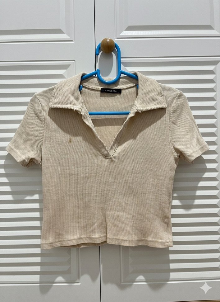 Bej renkli, kısa kollu, keten kumaştan yapılmış, yakalı ve dar kesim kadın gömlek. Günlük ve sokak tarzı için uygundur.
