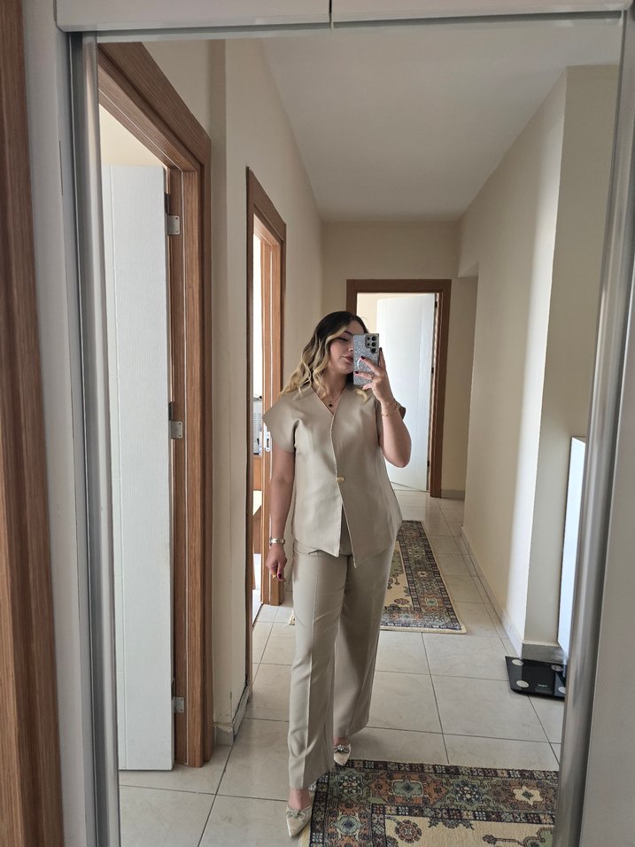 ceket pantolon takım Bej renkli, kısa kollu kadın takım elbise, midi boy ve regular fit. İpek gibi kumaştan, yakası kesik ve desensiz, ofis için şık ve rahat bir seçim.