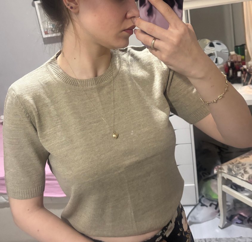 Bej renkli, kısa kollu, yuvarlak yakalı triko. Rahat kesimi ve midi boyuyla minimal ve şık bir görünüm sunar. Hiç dışarıda giyilmedi gözüktüğü gibi