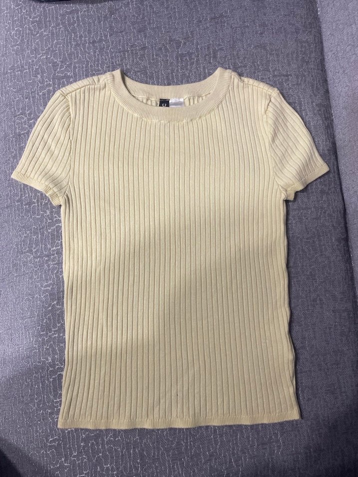 Bej renkli, kısa kollu, bisiklet yakalı ve vücudu saran kadın triko tişört, günlük kullanıma uygun sade ve rahat bir stil sunar.