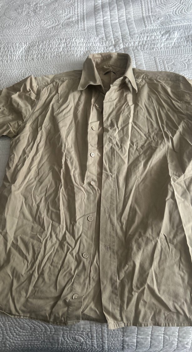 Bej renkte, kısa kollu keten erkek gömlek. Düğmeli ve yakalı, bol kesimdir. Günlük ve ofis kullanımı için uygundur.
