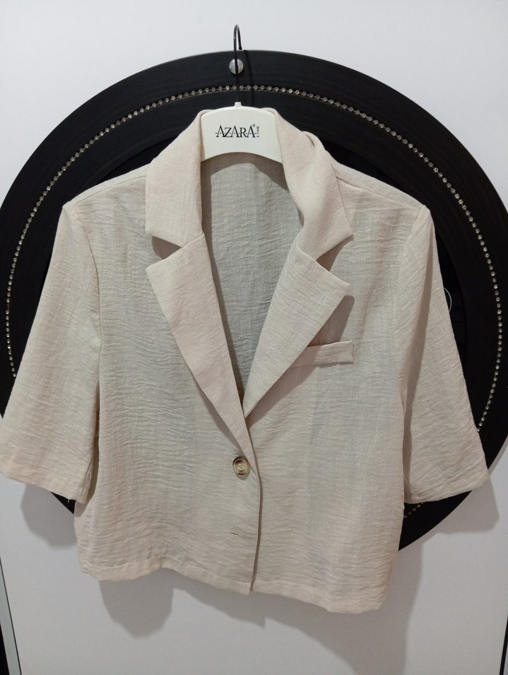 Bej Kısa Kollu Keten Kadın Blazer Ceket