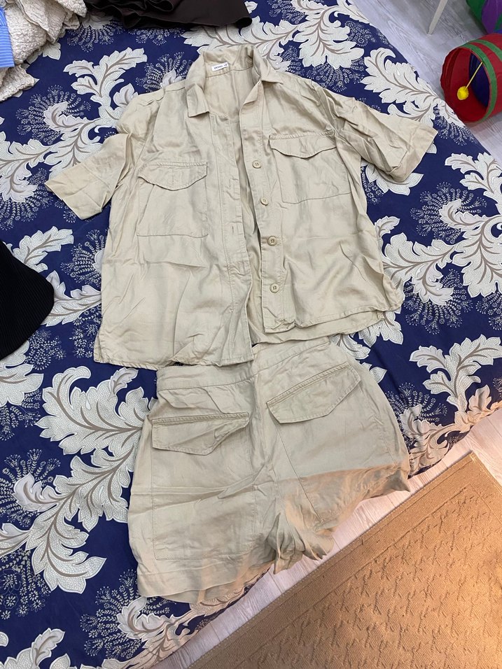 Bej renkli, kısa kollu keten kumaştan kadın takım, kısa boyda ve bol kesimlidir. Çıtçıtlı, cepli ve yaka detaylıdır, gündelik dış mekan kullanımı için uygundur.