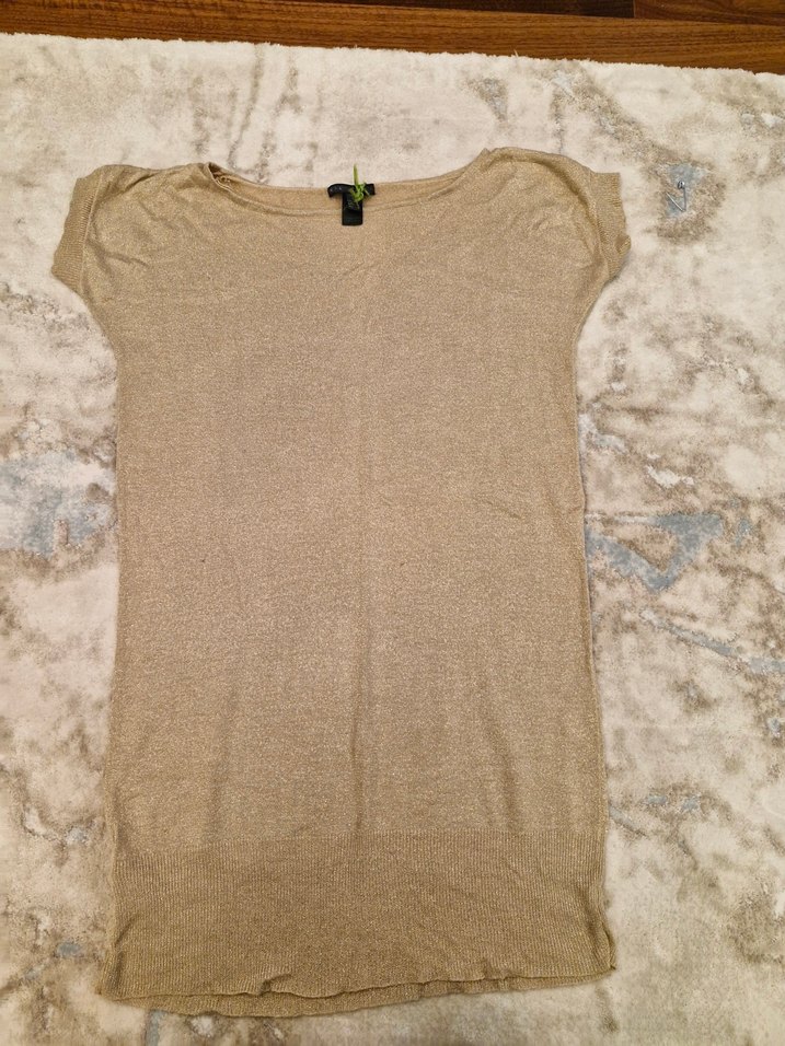Bej renkte, kısa kollu ve yuvarlak yaka kadın tişörtü. Yumuşak keten kumaştan, rahat ve salaş kesim. Düz desensiz, midi boy, günlük kullanım için uygun.