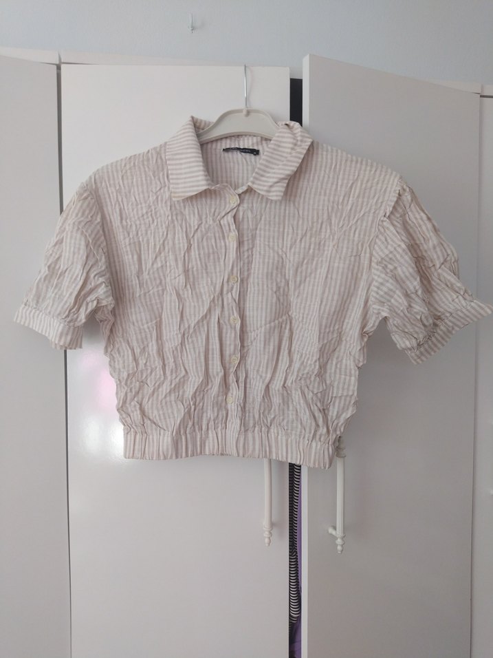 Bej renkte, keten kumaştan, kısa kollu, yakalı ve düğmeli, salaş kesim mini gömlek. Günlük sokak stiline uygun rahat tasarım.