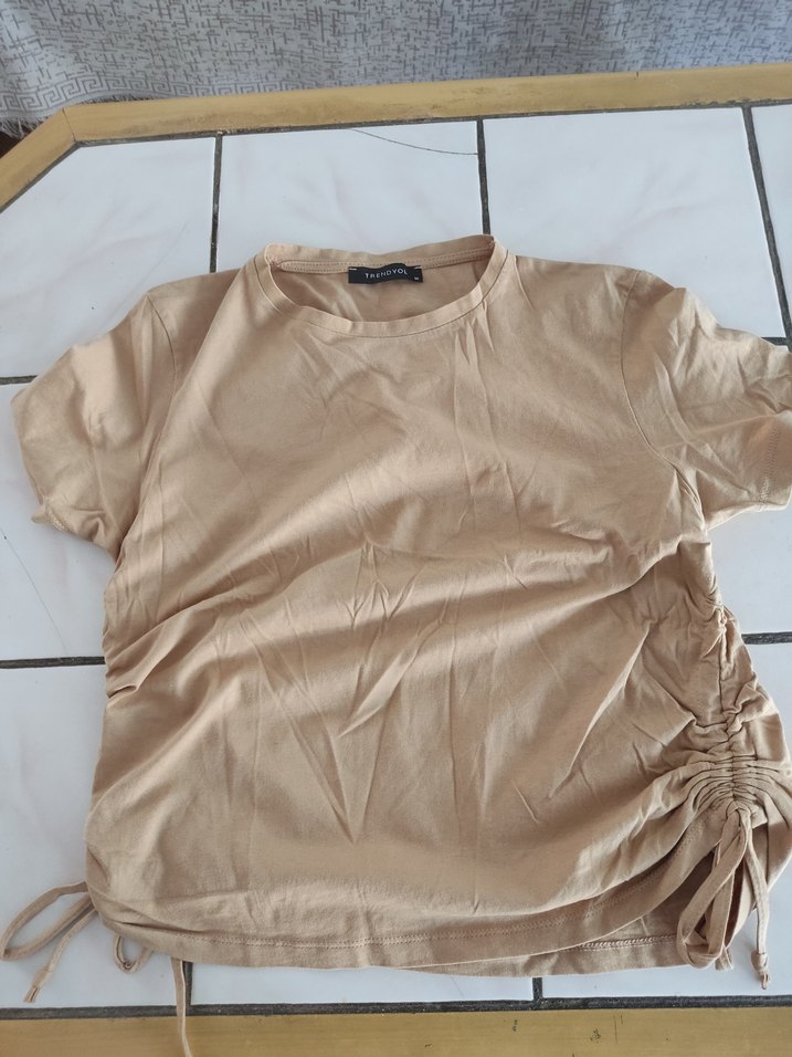 Bej renkte, keten kumaştan, kısa kollu ve yuvarlak yakalı, yanları büzgülü bol kesim tişört. Günlük rahat stil için uygundur.