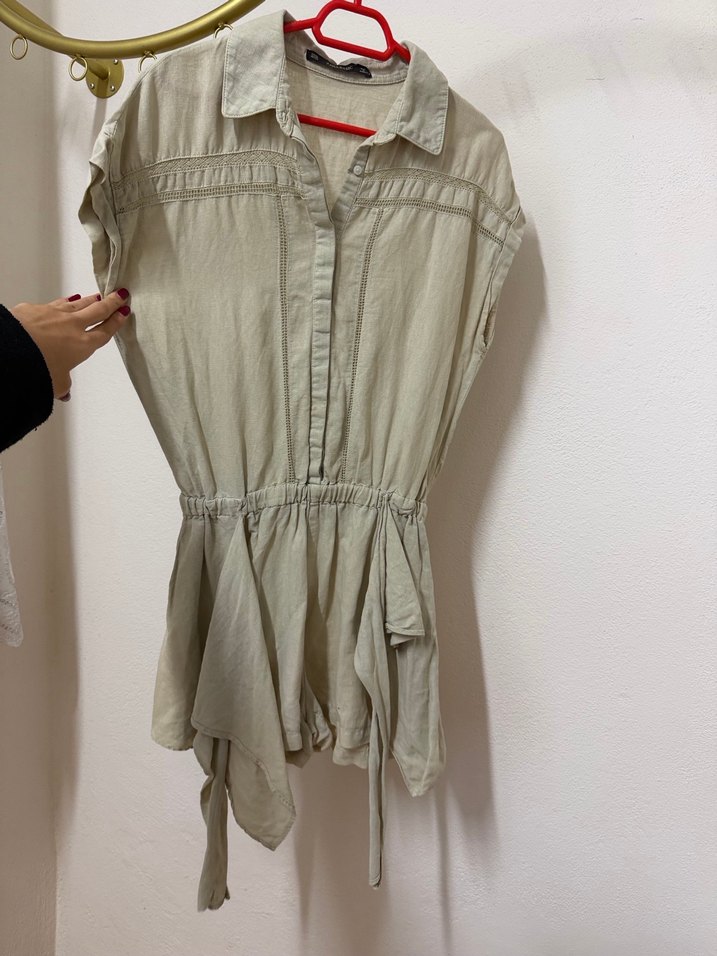 Bej renkli, keten kumaştan, kısa kollu ve düğmeli, bol kesim tulum. Bohem ve rahat tarzıyla günlük kullanıma uygundur. sırtında ufak bir leke var