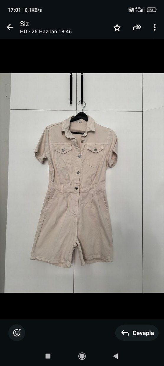 Bej renkli, kısa kollu, düğmeli ve rahat kesim keten tulum. İki göğüs cebine ve yuvarlak yakaya sahiptir, günlük rahat stil için uygun. çok rahat ve kaliteli duruş sağlıyor. S-M arası bedenler çok rahat kullanabilir. Sadece bir akşam giyildi. dolabımı boşaltıyorum.
