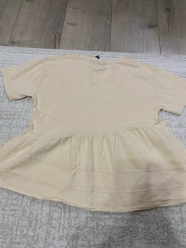 Bej renkli, kısa kollu keten kumaştan, salaş kesim ve bisiklet yaka kız çocuk bluz. Midi boyu ile günlük rahat ve şık bir tercih sunar. #zara #kızçocuk #tişört #şort