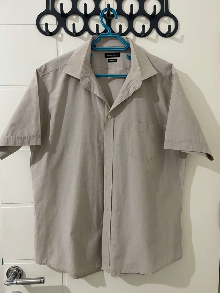 Kısa kollu, yakalı ve düğmeli önü olan bej erkek gömlek. Keten kumaştan, normal kesim ve ofis ya da günlük sokak tarzı için uygun.