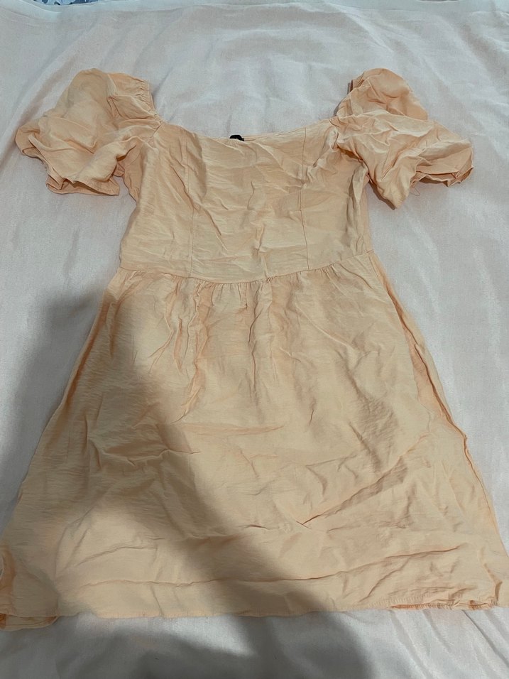 Bej renkli, kısa kabarık kollu ve oturan kesimli keten midi elbise, fırfır detaylı ve askısız yakaya sahip, vintage bohem tarzda.