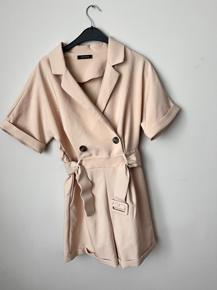 Bej renkli, kısa kollu mini tulum. Notlu yaka, düğmeli ön kapama ve belde kuşak detayına sahiptir. İpeksi dokusuyla rahat ve şık bir görünüm sunar. Sadece kemeri yıkandığında büzüştü başka bir sorunu yoktur