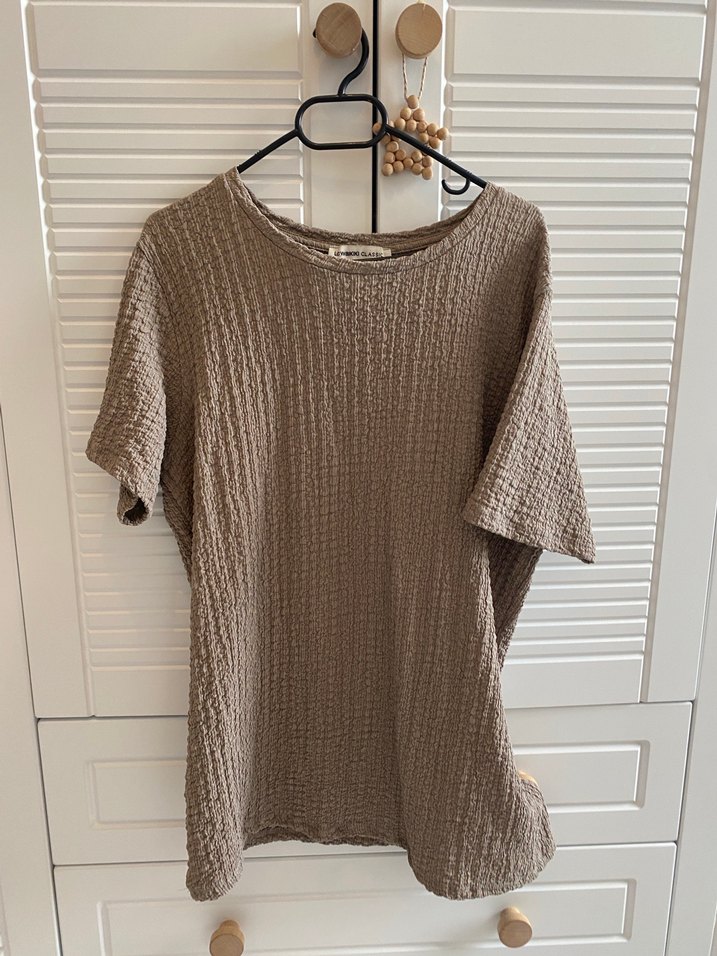Bej renkli, kısa kollu, yuvarlak yakalı, örgü dokulu hamile bluzu. Bol kesim ve keten kumaş kullanılarak rahat bir görünüm sunar.