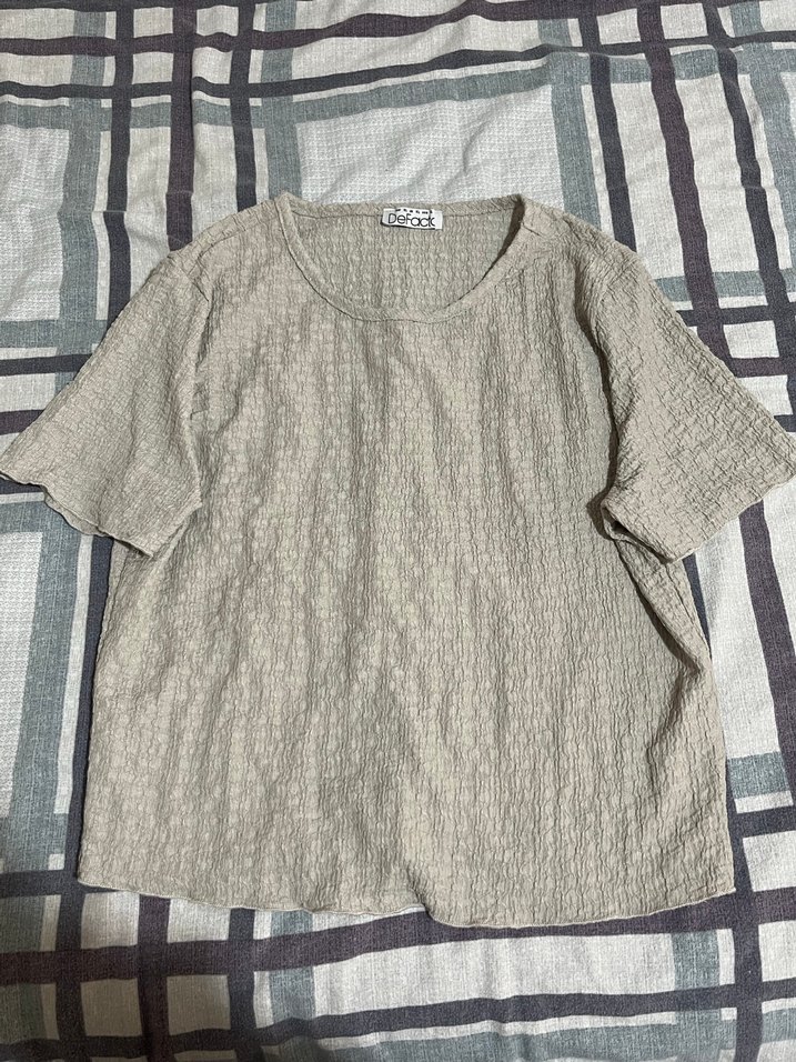 Keten kumaştan, kısa kollu, örgü dokulu, bej renkli, salaş kesim kadın gömleği. Minimalist ve normcore tarzda, günlük kullanıma uygun.