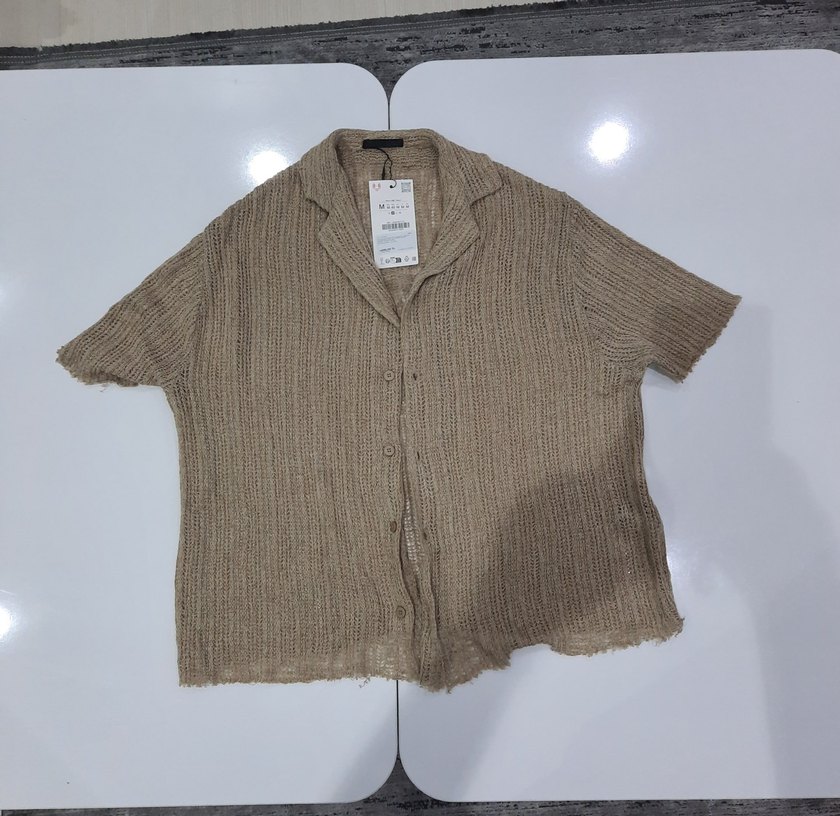 Bej renkte, kısa kollu, örgü dokulu keten erkek gömlek. Bol kesimiyle rahat, kısa boyda günlük kullanıma uygun. Fiyat pazarlığına açık.