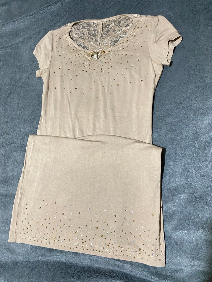Bej renkli, kısa kollu, V yakalı, payet detaylı, vücuda oturan midi elbise. Yumuşak sentetik kumaştan, günlük sokak stili için uygun. ✨