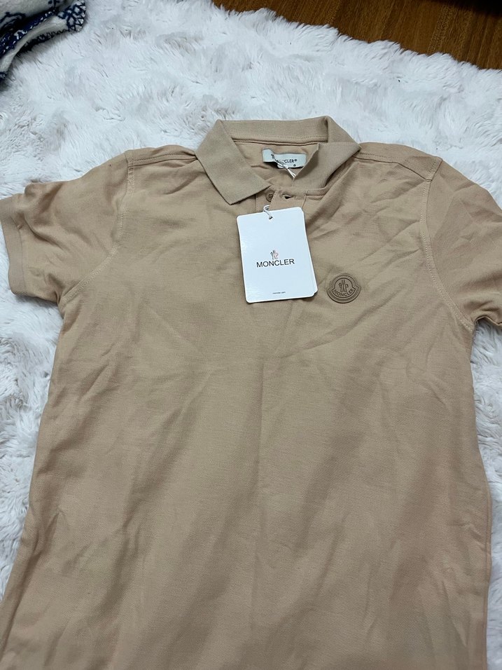 Bej renkli, kısa kollu, polo yaka erkek tişört. Yumuşak keten kumaştan, düğmeli ve bol kesimlidir. Günlük kullanım için uygun, rahat sokak stili.