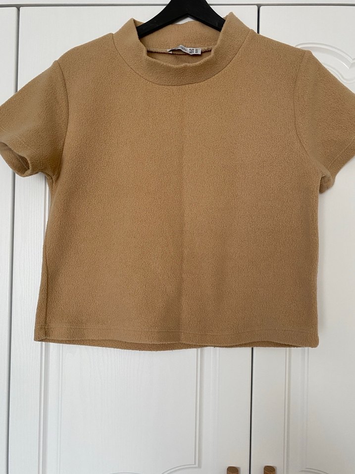 bej kısa kollu tişört, yuvarlak yakalı ve yumuşak, sıcak kumaştan üretilmiştir. Düz tasarımıyla sade ve şık bir sokak stili sunar.